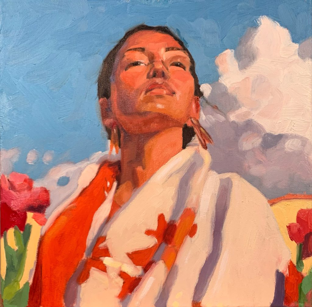 This piece is as much about identity and resilience as it is about light and color. It’s a meditation on the intersection of cultures—Indigenous, Hispanic, and contemporary life in Northern New Mexico. I painted her looking slightly upward, eyes almost closed in sun-drenched peace, because that’s how I remember her: inwardly strong, outwardly luminous.