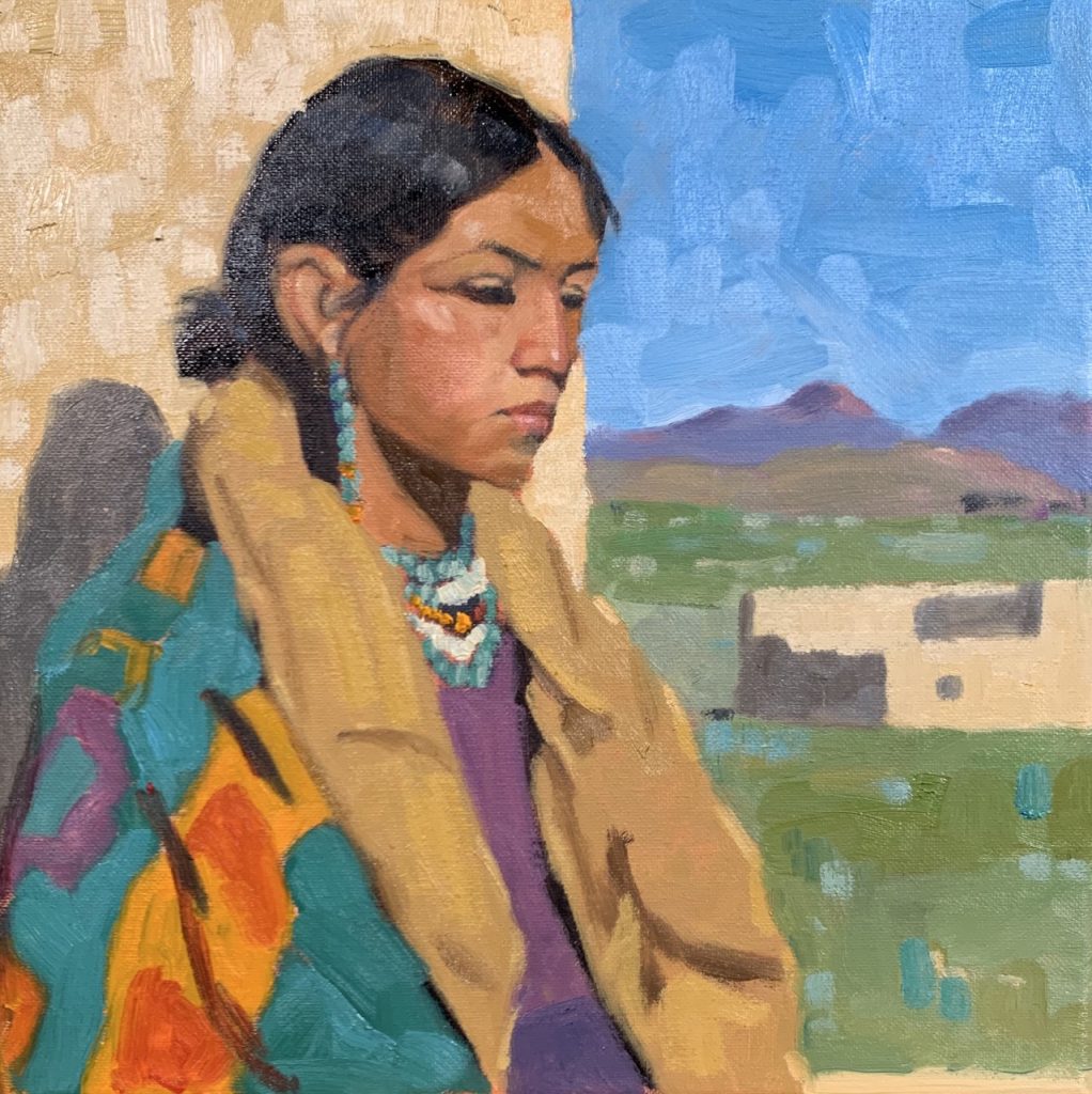 This oil painting is trying its best to capture slightly contemplative and evocative moment, portraying a Taos woman bathed in warm sunlight, her expression filled with introspection. The sun casts a golden glow on her face, creating rich contrasts of light and shadow that emphasize her features and the texture of her garments. (Well, more shapes than texture.) The stucco wall behind her reflects some of the sun, its rough, earthy texture almost blending with the adobe structures in the background.